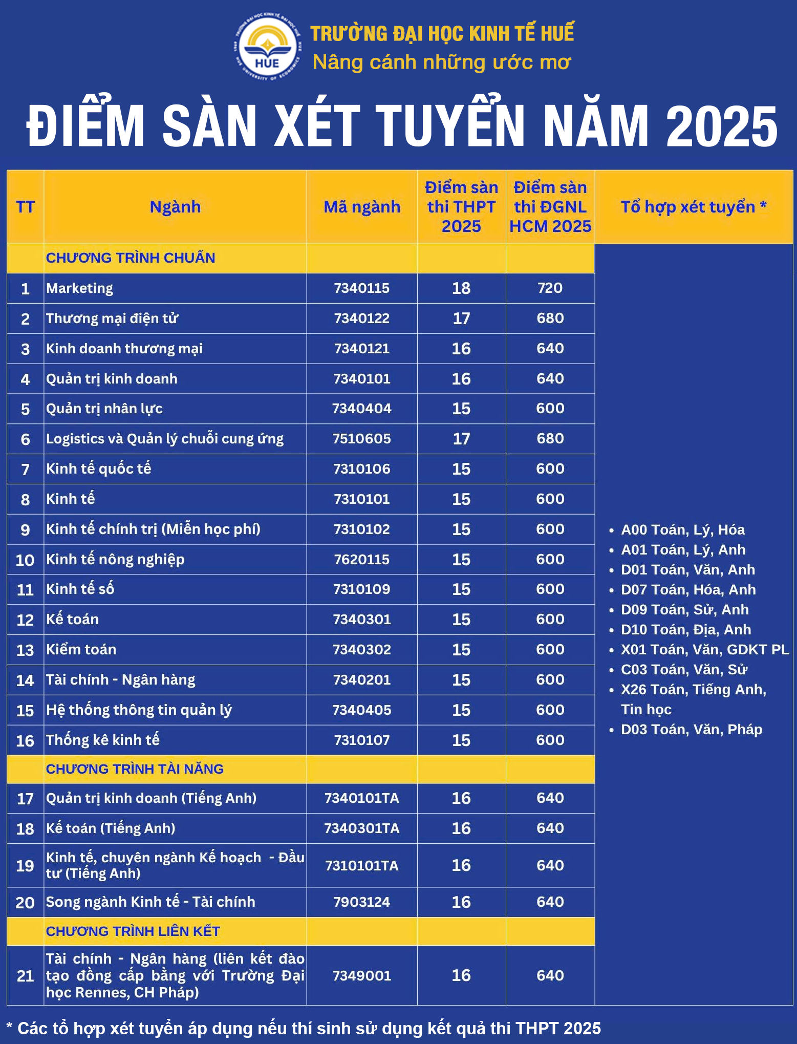 Trường Đại học Kinh tế, Đại học Huế thông báo ngưỡng đảm bảo chất lượng đầu vào (điểm sàn) năm 2025. Điểm sàn là mức điểm tối thiểu thí sinh phải đạt được để đủ điều kiện cần nộp vào ngành muốn xét. Mức điểm sàn thi THPT từ 15-18 điểm; Đánh giá năng lực ĐH Quốc Gia TP.HCM từ 600 – 720 điểm tùy từng ngành, thí sinh tham khảo ở bảng bên dưới: