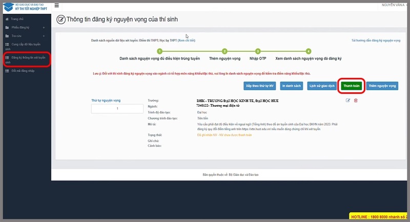 Để đảm bảo quá trình đăng ký xét tuyển diễn ra suôn sẻ, thí sinh cần nắm rõ cách thanh toán nguyện vọng đại học theo đúng quy định của Bộ GD&ĐT. Hiện tại, số lượng nguyện vọng không bị giới hạn, tuy nhiên mỗi nguyện vọng sẽ có mức lệ phí là 15.000 đồng. Để thực hiện cách thanh toán nguyện vọng, thí sinh cần thực hiện tuần tự theo các bước sau: