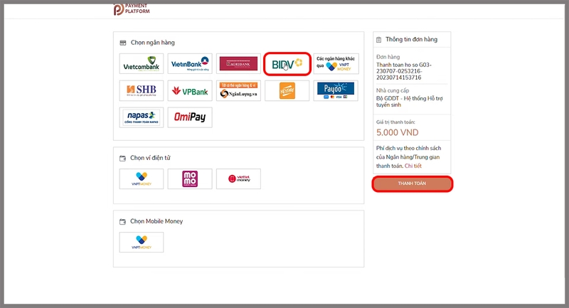 Bước 4: Hệ thống sẽ hiển thị các phương thức thanh toán như qua Internet Banking, ví điện tử (Momo, VNPT Money, Viettel Money,…), hoặc các cổng thanh toán điện tử liên kết. Hãy chọn hình thức phù hợp và nhấn Thanh toán.
