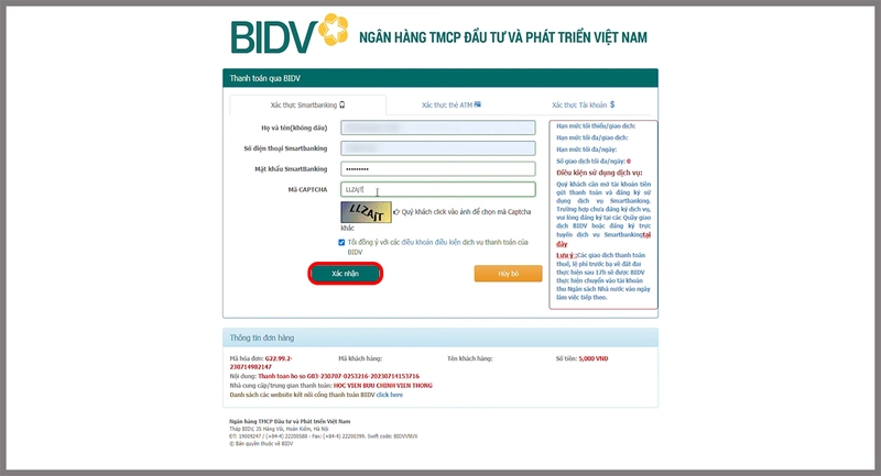 Bước 5: Nhập đầy đủ thông tin thanh toán như số tài khoản ngân hàng hoặc thông tin đăng nhập ví điện tử, rồi nhấn Xác nhận để hoàn tất việc nộp lệ phí xét tuyển.