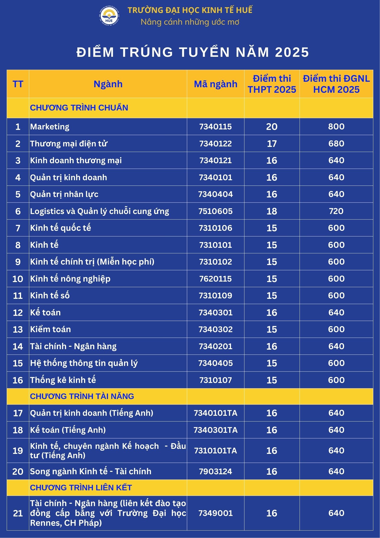 Trường Đại học Kinh tế Huế công bố điểm chuẩn trúng tuyển năm 2025 của các ngành và hướng dẫn thí sinh các bước xác nhận trúng tuyển, làm hồ sơ nhập học. Thí sinh lưu ý đọc kỹ phần 2 để làm đúng quy trình xác nhận trúng tuyển.