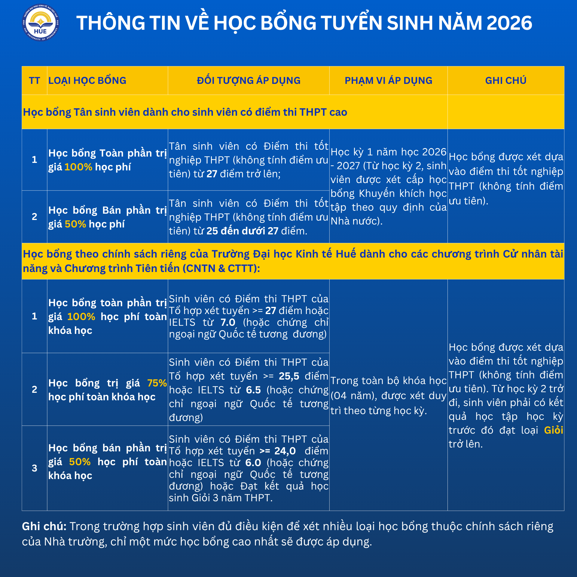Trường Đại học Kinh tế Huế triển khai nhiều chính sách học bổng hấp dẫn dành cho tân sinh viên năm 2026