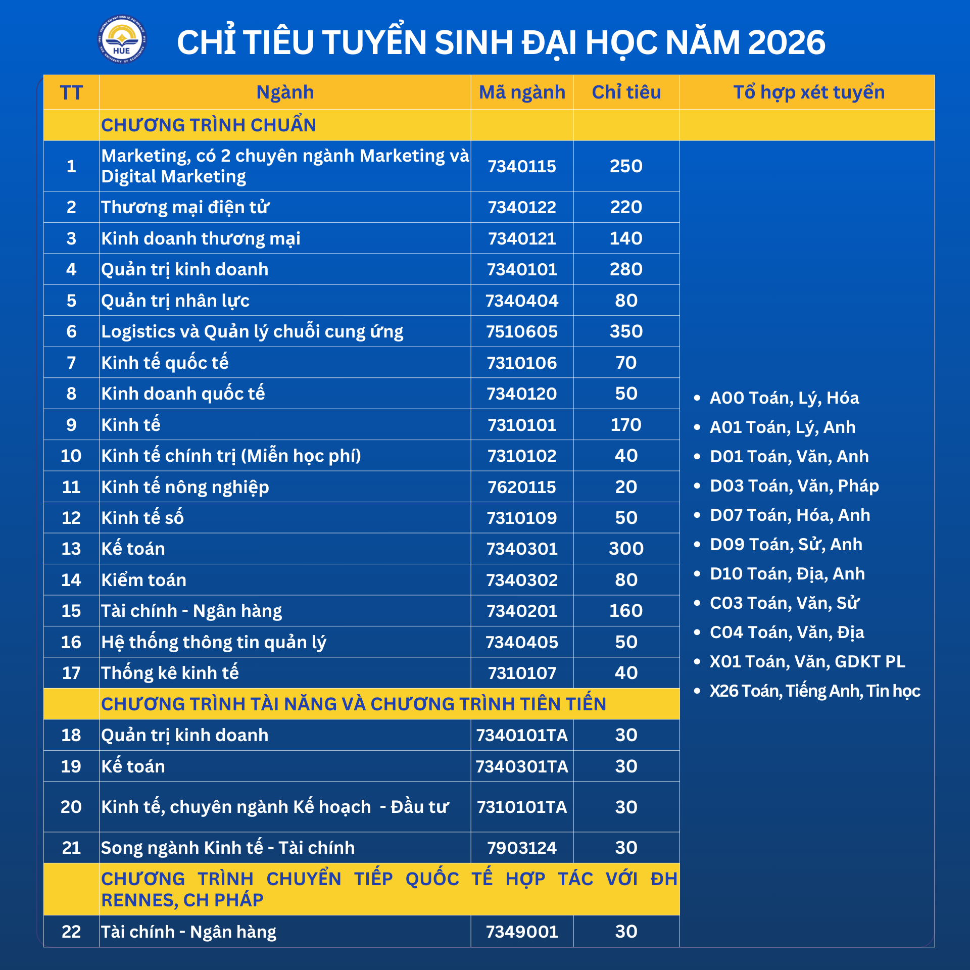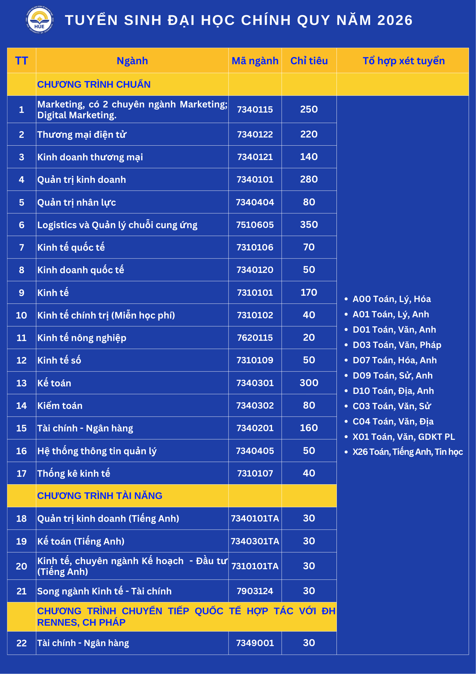 Năm 2026, Trường Đại Kinh tế, Đại học Huế công bố 5 phương thức tuyển sinh, với 11 tổ hợp môn xét tuyển
