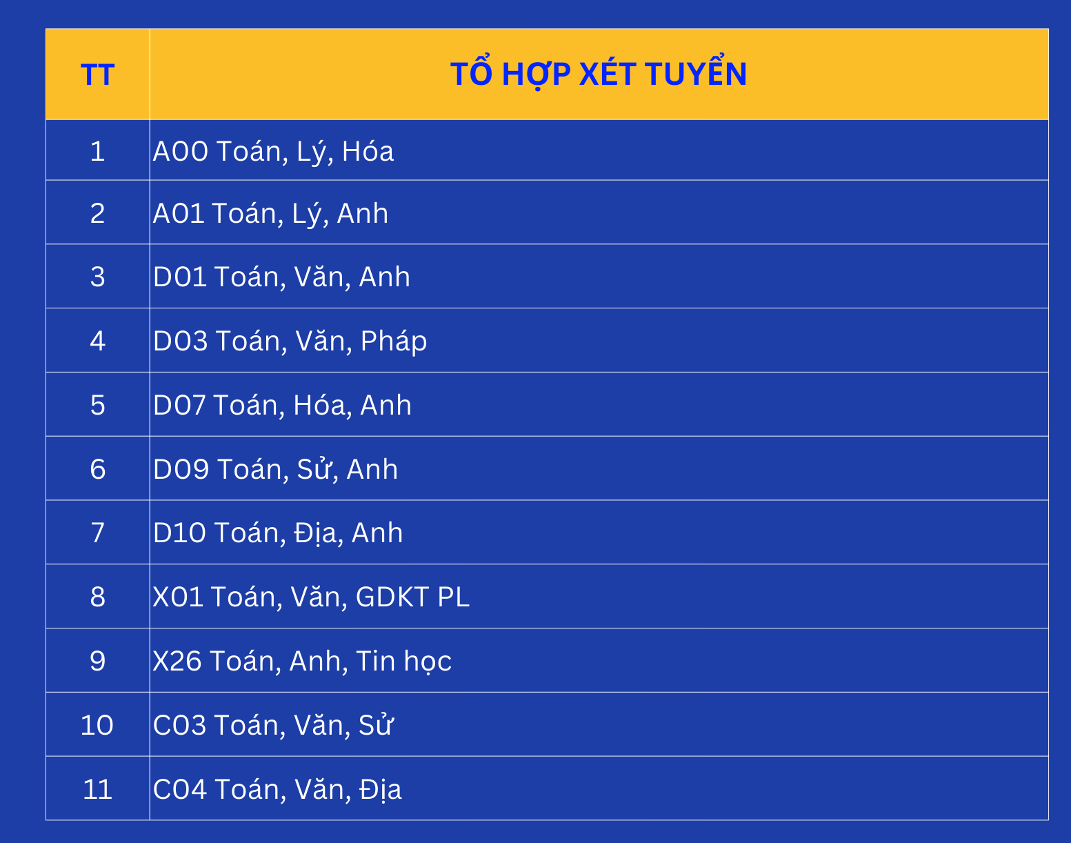 11 tổ hợp môn xét tuyển